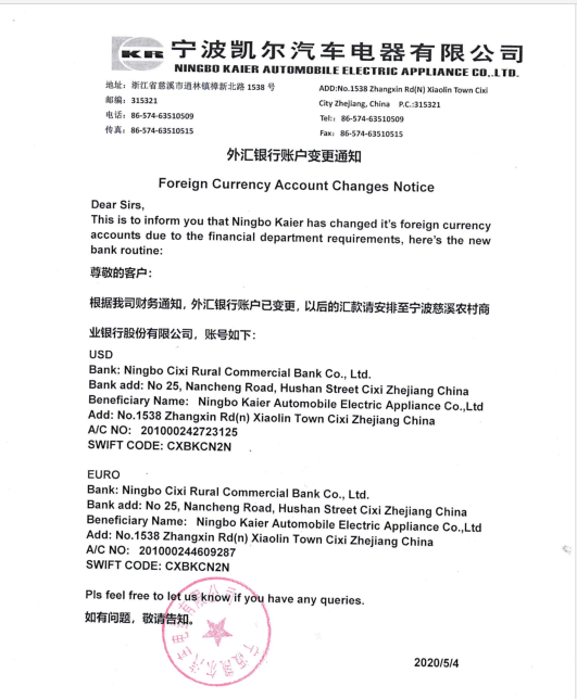 尊敬的客戶: 根據(jù)我司財(cái)務(wù)通知,外匯銀行賬戶己変更,以后的,以后的匯款請安排至寧波慈溪農(nóng)村商業(yè)銀行股份有限公司